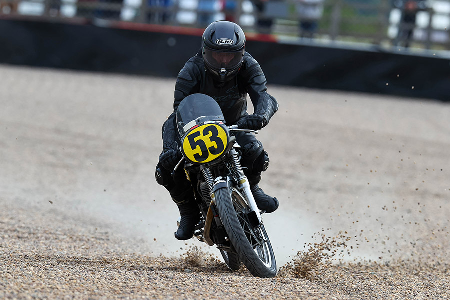 This time Mike Russell was determined, all those years’ experience would be thrown at this one, the Kermit’s going to be put in his place! Mark Taylor took the hole shot, Mike was on him, lap two Mikes past but Mark is right with him and never more than a spit behind, Mark lines him up on the last lap and like a shot he’s past, a last push to the finish has the preverbal fag paper between them, what a race, terrific skills on show. Just behind I’m having my own battle with that man Jake and BSB Super-stock rider Max Symonds, a tight move by Max into Macleans got my gander up and after catching a good draft down the back straight into the last corner I hauled the brakes on at the last minute, literally and sailed past them both just holding the line and bouncing valves to the finish it was close. Jake was happy with first Clubman from Robin Stokes and Seb Perez who was involved in the cracking Angela Cragg, Alex Williams, Richard Dawson, Andy Glasgow and Stuart Tonge fisticuffs’ mid pack! Welcome Mr Hose pipe, Mike Hose once again enjoyed riding in the Lansdowne, a classy rider much missed of late.