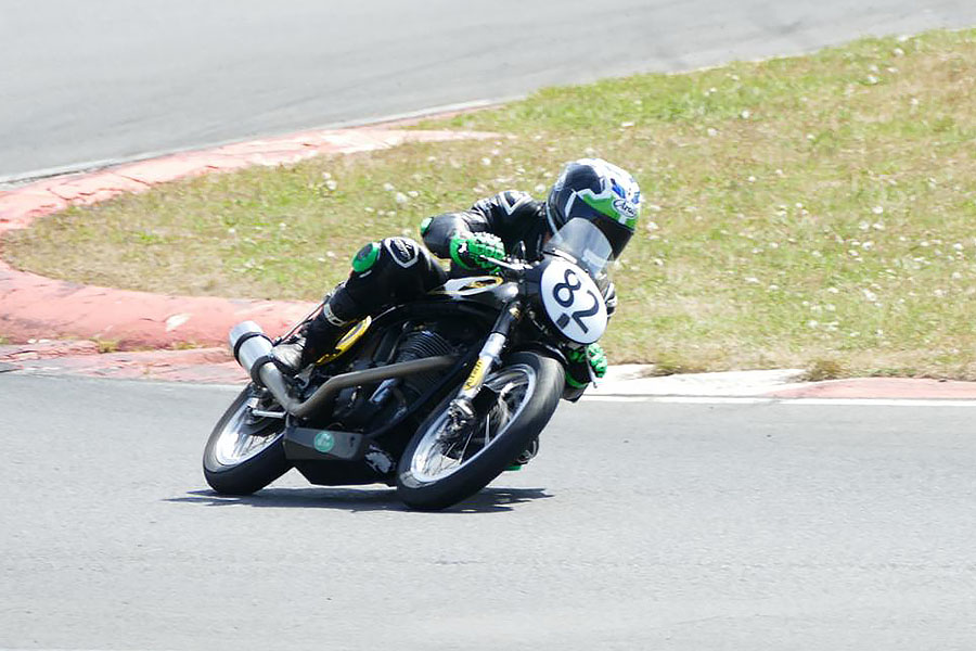 I really pushed on for the next three or four laps before sighting Jake Dettloff ahead. I smiled to myself as he looked back, and I could physically see him react and push on. Spurred on I set after him. My tyres, both back and front (especially the front) protesting, making holding my line very difficult. But still Jake looked back and still the gap decreased until on the last lap I was on him, and then entering the long back straight the front tucks wildly and I’m so close to going down but it only adds to the excitement! I’m close enough to be a barnacle on Jake’s left bum cheek, he signals with a pat on his arse!
