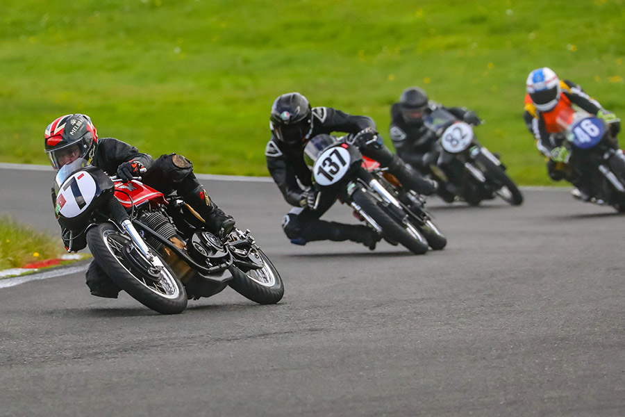 Mark Taylor made the hole shot as the local lad gave it his all into the hideously fast, positive cambered, Paddock Hill bend, his competition just holding onto his coat tails, as a collective stampede, we drive hard into the Suspension flattening Hailwoods Hill, leaving the braking for Druids bend until the very last second, jockeying for position, the field finds its competitive pockets of fired up pilots. Up front lap times are almost identical for the first three Taylor, English and Jackson with English showing his experience and talent to take the win from Mark Taylor and Dan Jackson, Graeme Higlett rode a smooth race into into forth ahead of current champion, Tony Perkin and a very under the weather Matt Hebb from Luke Bailey. In eighth overall Seb Perez was on fire in the 500 clubman class as was Stefan Radacovic in ninth. Richard Dawson had Harry Cole breathing down his neck (I’ve heard he quite likes that?) though managed to hold on past the flag for them to take second and third Clubman and class trophies. Stuart Tonge took a nice pile of points fourth in class with young whipper-snappers Alex Williams, Martin Thrower and Simon Hocking ready to pounce if Stuart so much as blinked after a great battle. Paul Stephen’s was very happy with his machine, pushing hard he couldn’t quite match Steve Higgins big v-twin Vinnie the pair accepting the Ian Bain hand made Pre-55 trophies with Brian Riley not far behind after posting some cracking lap times on his Dommi. Jack Hebb once again kept his competition at bay with another textbook performance in the 350 class from Cliff ‘twinkle toes’ Ransley and Big Seb’s ‘mini-me’ Seb Perez Jnr in third.